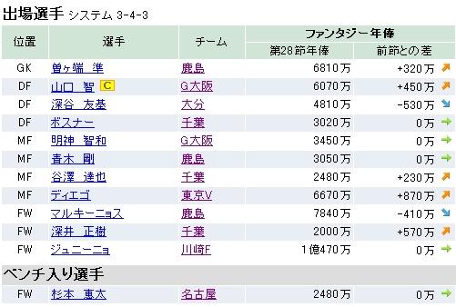 まずは第28節の結果なんですけど・・・、84fpでした。名古屋勢が伸びなかったのは誤算。ジュビロ前田のハットトリックのおかげでなんとか及第点を保ったってとこでしょうか。現在の資金は5億9320万です。