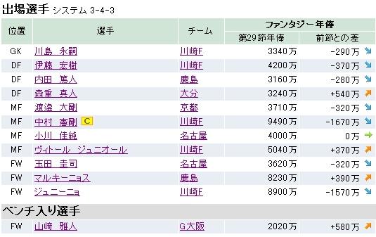 まずは第29節の結果なんですけど・・・、92fpでした。なぜだかけっこう良かったです(笑)。ディエゴを選んでた自分にビックリしてます。他のFWがもうちょっと頑張ってたら3ケタいったのになぁ。現在の資金は6億410万です。