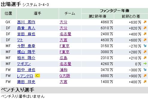 まずは第2節の結果なんですけど・・・、73fpでした。ジュビロに快勝したってのにガンバ勢があんまり伸びなかった。エスパは全然点が取れないし・・・。現在の資金は4億3270万です。
