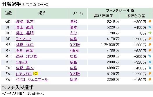 まずは第15節の結果なんですけど・・・、87fpでした。あれ?思ったよりよかったな。ボスナーが-4fp、モンテの小林は不出場ということで期待薄だったんですが、遠藤・石川・エジらで盛り返したみたい。現在の資金は5億6630万です。