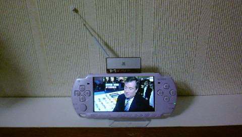 アンテナを延ばして地域設定。それだけで・・・、映りました、ワンセグ!さすがにPSPだと画面が大きくていいんですが、逆に大きすぎてぼやけた感じにもなっています。