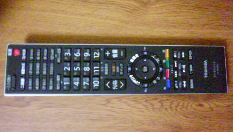14型のTVからのスケールアップなので、なかり大きく感じます。しかも6畳の部屋ですからね。最初は20型や26型くらいの安いの買おうと思ってたんだけど、いろいろ調べていくうちに、「どうせ買うなら綺麗な画像のフルHDがいいよなぁ」ってことで、ちょっと無理しちゃいました(汗)。で、こちらがリモコン。