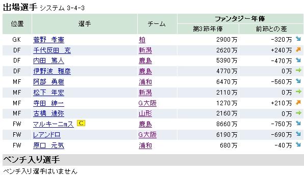鹿島から3人。マルキにキャプテンを任せます。新潟、ガンバ、浦和から2人ずつ。原口の安さについつい手を出してしまいました(笑)。寺田が出るのかどうかは最後までチェックが必要ですね。新潟には個人的に頑張ってほしいなぁ。