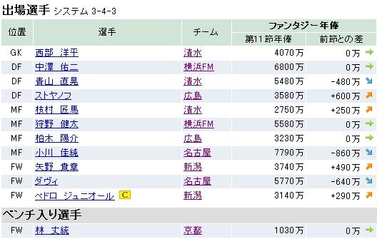 まずは第11節の結果なんですけど・・・、108fpでした。キターーーΣ(∀゚ノ)ノ 今季2回目の100fp越えです!!今のところ、かつてない成績かも。イ・グノにレアンドロ様々です♪ 現在の資金は5億3620万です。
