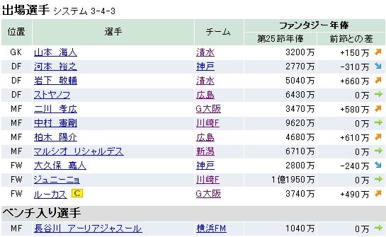 中断となった鹿島-川崎の選手は対象外になるらしいですね。管理人はスタメンには入れてなかったから文句は無いけど、痛手を負った人は多そう・・・。現在の資金は6億1640万です。そろそろ3ケタ実現したい!・・・ってことで第26節。