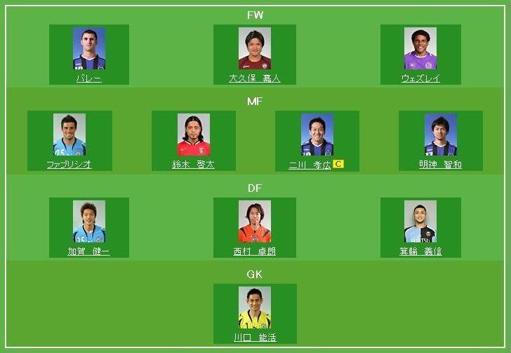 ガンバから3人。万博22戦無敗は伊達じゃないでしょう。磐田からも3人。加賀はお買い得だな。でも監督がころころメンバーを替えるんで不安。アウェイで活躍するウェズレイ、中盤で頑張ってる大久保を選んでみました。あと、やっぱり浦和と川崎は外せないか!?ってことで1人ずつ選出。