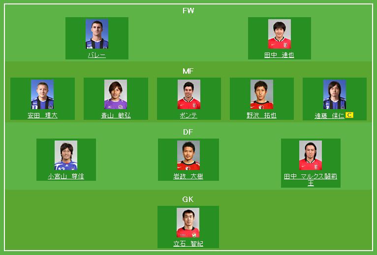 今回は堅くいきます。ガンバとレッズから3人ずつ。安田は最近フル出場が多くなってきたんで選んでみました。田中達也は安くていいねぇ。調子のいい鹿島から野沢・岩政を。ここで資金が足りなくなったんで、青山、立石とリーズナブルな選手を入れて完了。