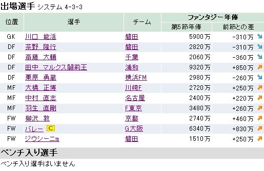 まずは第5節の結果なんですけど・・・、47fpでした。やっちったーー!!(´д゚lll) キャプテンに指名した大久保一発退場です。fpがマイナスになっても2倍されんだね。あーびっくり・・・。やばい、この調子じゃ降格しちまう(汗)。現在の資金は4億2300万です。
