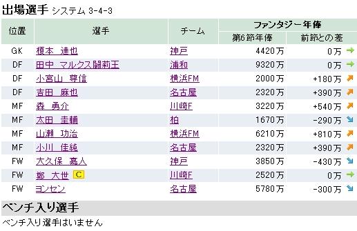 まずは第6節の結果なんですけど・・・、65fpでした。相変わらず低迷してます・・・(l|li′△`) ジェフの斎藤がマイナス。う~ん、毎回マイナスの選手がいるような(汗)。マジで降格が現実味を帯びてきました。現在の資金は4億3740万です。