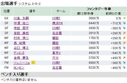 まずは第12節の結果なんですけど・・・、51fpでした。2週連続の体たらくです(泣)。まさか大宮がホームで札幌に負けるとは。悪い時は裏目裏目に出るんだよな。勝ったチームの選手が1人だけって、一体?現在の資金は4億4940万です。