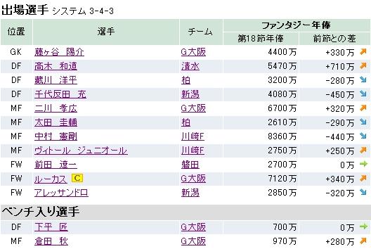 ガンバから3人。バレー退団を吹っ飛ばすような快勝を期待してます。ルーカスをCAPにしてみました。前節レッズを破った川崎から2人。新外国人は使えそうです。割安だしね。日本代表候補に復帰した磐田の前田は一押しですね。1G2Aくらいしてくれたら最高なんだけど。